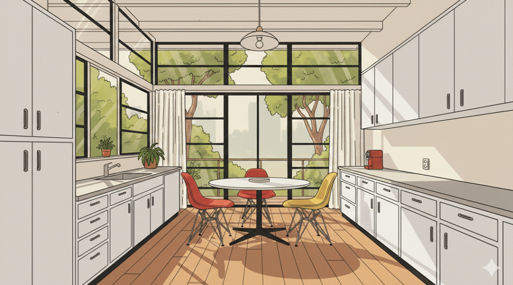 モダンデザインの象徴ともいえる住宅で、家具と建築、生活が一体となった空間は現在でも多くの人々に影響を与えています。