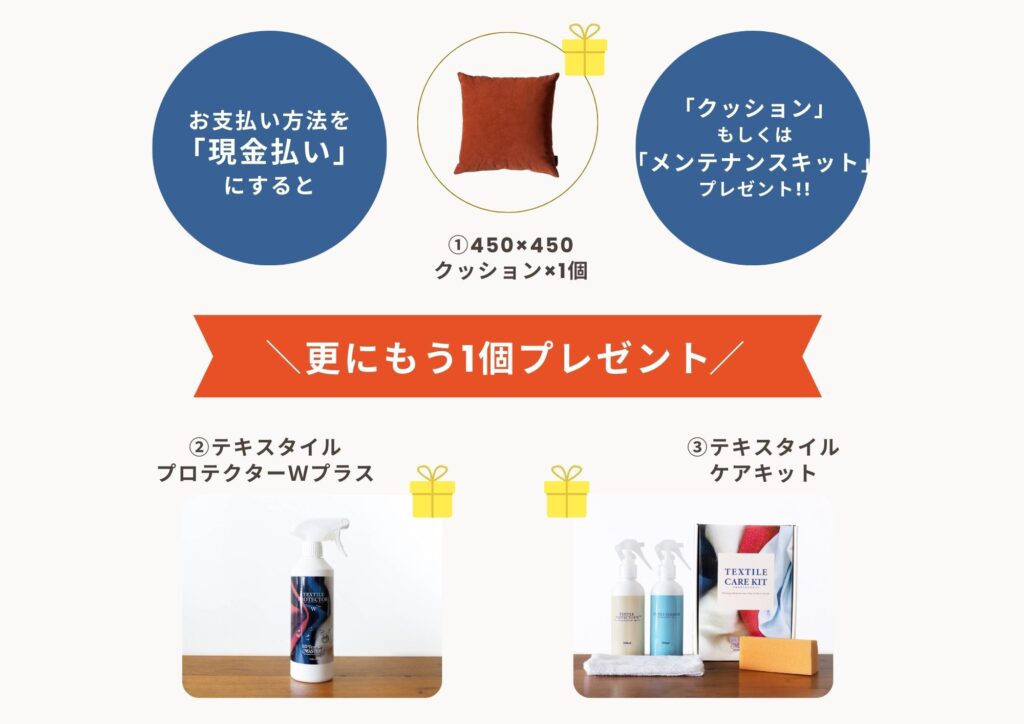 お支払い方法が「現金払い」の場合、プラスで下記からおひとつ選べる特典が付いちゃいます↓↓↓