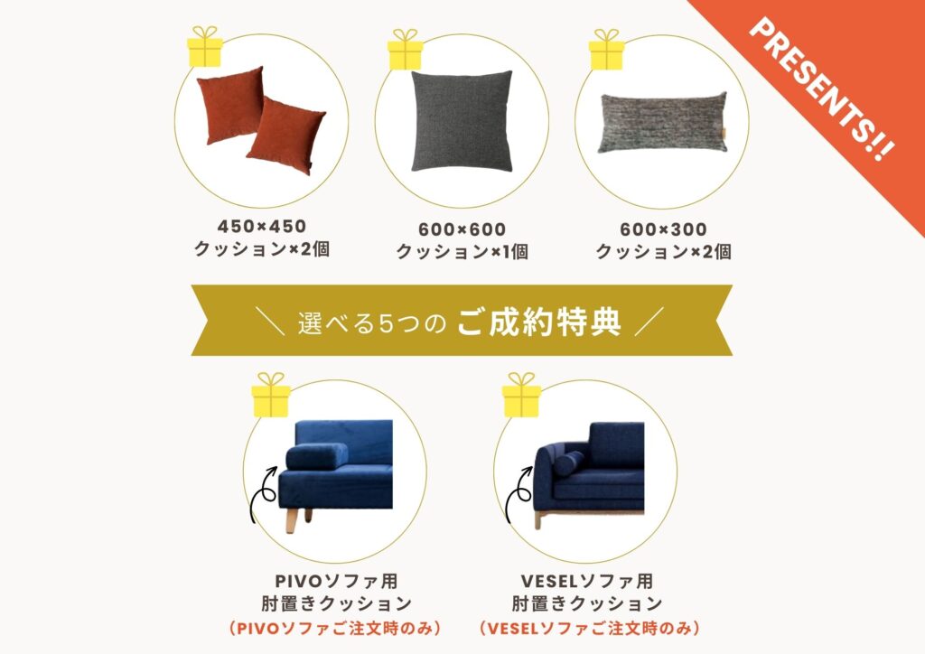 ※一人掛けソファの場合は、450角クッション1点、もしくは600×300クッション1点のどちらかをプレゼントいたします。